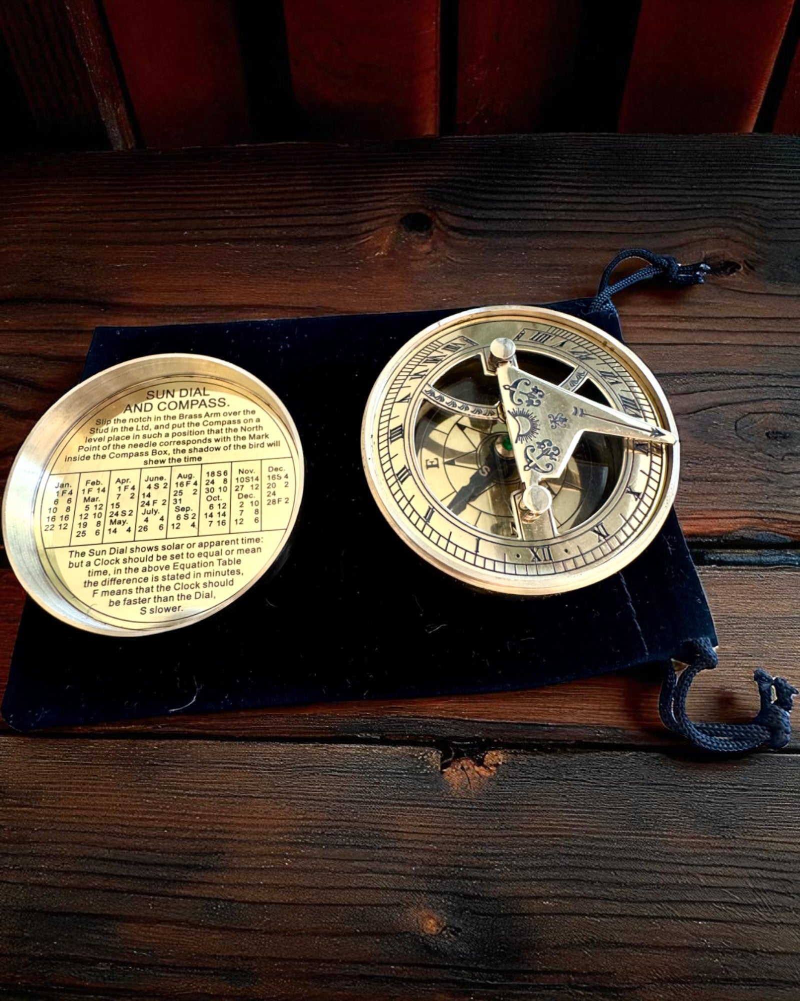 Oppdag den bemerkelsesverdige kombinasjonen av tradisjon, vitenskap og håndverk – håndlaget messing solur med kompass. Dette er en unik gjenstand som kan fungere som et funksjonelt verktøy, stilig dekorasjon eller personlig gave med gravering.